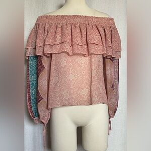 Boho at its best! Two layers of ruffles from elastic neckline to bustline. Long sleeve with self tie at wrist. Body of shirt is semi sheer.