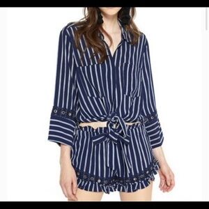 Misa Los Angeles Navy White Stripe Button Down Shirt. Front welt pockets. Can be tied up in front or let loose.