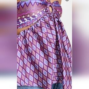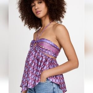 BNWT. Stylish silk halter top with a ring detail. Features a vibrant purple geometric pattern. Perfect for casual outings.
