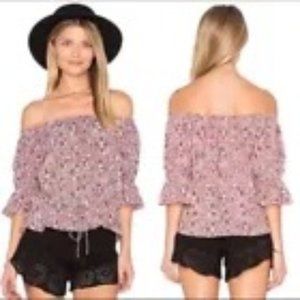 Stunning Misa Los Angeles women's red/white/blue floral print ZALTANA off-the-shoulder blouse. Elasticized top. Short puff sleeves with elasticized cuffs. Drawstring peplum waist. Made in the U.S.A.