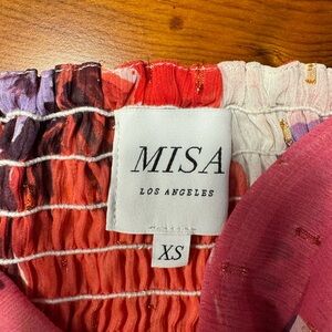 This stunning maxi skirt from Misa Los Angeles features a vibrant red and purple floral design, perfect for cocktail or resort wear. Ideal for making a bold statement at any event.
