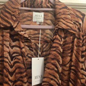 Misa Elegant animal print dress with flowing design. Button down with tie waist. Ruffled hem and wrists. Sheer with extra lining. Perfect for any occasion. Great for layering. Especially for your swimsuit. Take on your honeymoon, vacation, beach party, barbecue, cruise, pool parties, graduation party, date night, girls night, resortwear, bachelorette party and much more!! NWT!! NEVER WORN!! Accepting reasonable offers!!