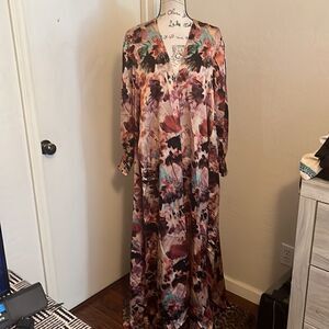 This is not an actual robe; that’s what the brand describes it as; it is a long top/kimono/wrap article of clothing-see photos. Boho, floral, festival, feminine, festival, contemporary, cruise, party, event, photos, travel, event, vacation, dinner, birthday, girls night out, nightclub, club