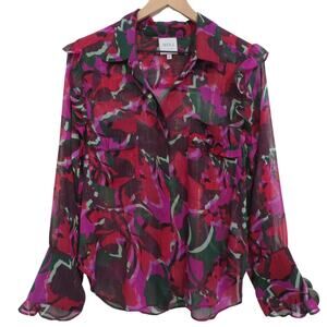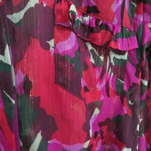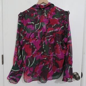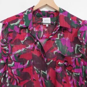 Misa Los Angeles multicolor button front top. Long sleeve top with a collar and button front. Sleeves have ruffles at the shoulders. Top has gold shimmer throughout. Sheer bodice.