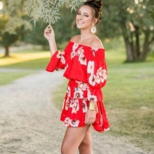 Fun red off the shoulder dress by misa Los Angeles. Excellent condition