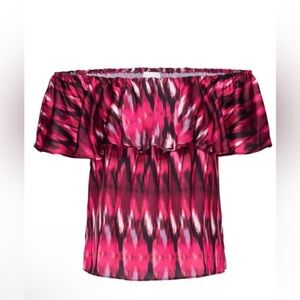 Perfect for this season and beyond, MISA'S newest Graziela is a feminine off-the-shoulder top cut from a fuchsia satin. An elastic neckline is accented by a wide ruffle trim.