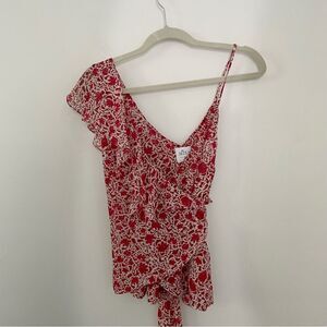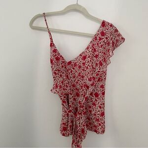 Estee asymmetrical top is cut from a rust animal floral