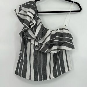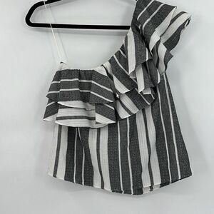 Misa Los Angeles Gray White Klea Stripe Ruffled One Shoulder Cotton Top Medium