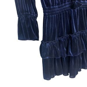 New with tag, velvet blue, tassels ties, long sleeve , blouson bodice, v-neck drop, flounce hem, short mini, 3 tiered, hugs waist, loose comfortable material. Dress is sold out.
