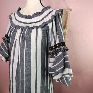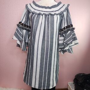 Chic tunic with ruffle sleeves and striped pattern. Features decorative trim on sleeves.