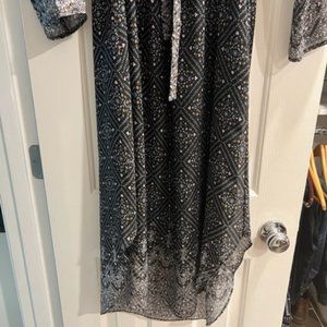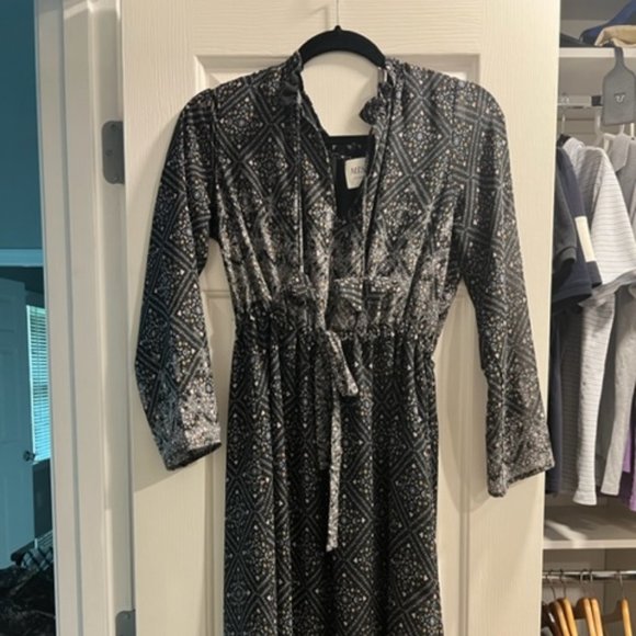 A long sleeved Misa Los Angeles black mix print dress with front tassles and a tie waist. It's a size XS but fits like a S because it's roomy. The waste tie can be adjusted for the best fit for you. The item is in excellent condition, it has only been worn a few times. I am happy with the asking price or the best offer.