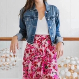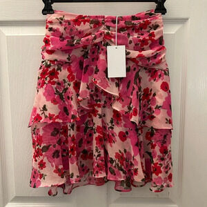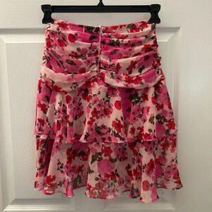 Misa los Angeles Elisa Mini Skirt Pink Floral Misa los Angeles Elisa Mini Skirt Pink Floral Size: Small Skirt measures approximately 19" length. Misa Los Angeles tiered ruffle mini skirt. The skirt is fully lined with a back zip closure and ruching a the front and sides of the skirt. 100% Viscose
