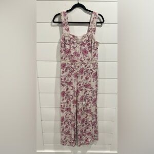 White and pink floral printed linen (85% Rayon, 15% Linen). Jumpsuit. Sleeveless. Square neckline. Pull on styling. Pockets
