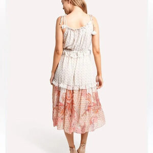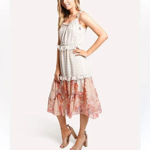Take on warm temps in the Misa Dionica Dress designed adjustable spaghetti straps and a flowy silhouette. Midi sleeveless dress in shades of beige, orange, red and white. A delicate ruffle trims the elastic waist and leads into a flowing tiered maxi skirt in this printed midi featuring a soft floral and bright paisley pattern. Dress this style up or down with heels or flats.