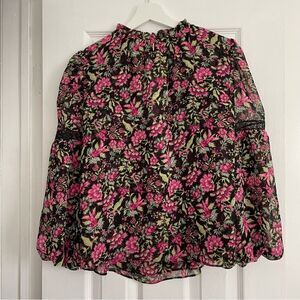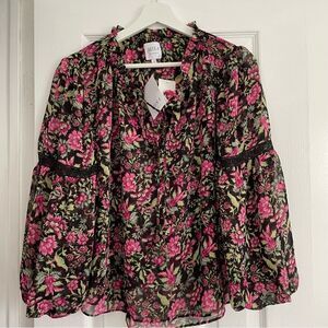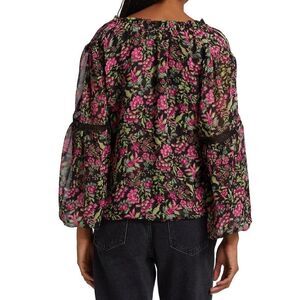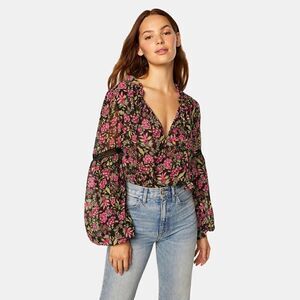 The Alicia floral blouse from MISA Los Angeles features a split neck with a tie detail and wide, flared sleeves.