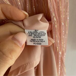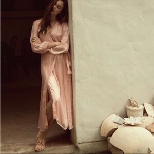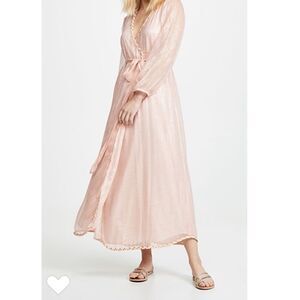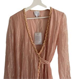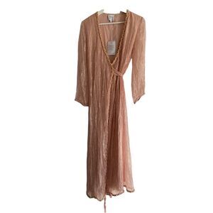 A long, wrap dress, features peach and blush lurex pin-stripes. Trimmed with a braided rope with a deep v-neckline and a self-tie waist. Long sleeves with elasticated cuffs.