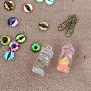 stick on eyes+5 counces in bottle+2 brass trinkets+5 large multi color lab gems(prism&glows)glow in the dark counce bottles