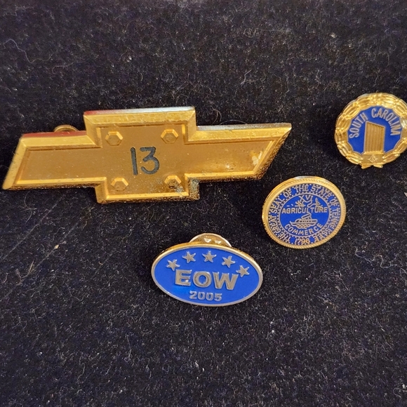 Set of four pins featuring gold and blue colors. Includes a Chevrolet logo pin.
