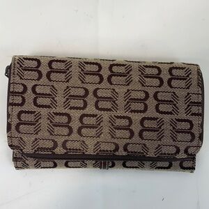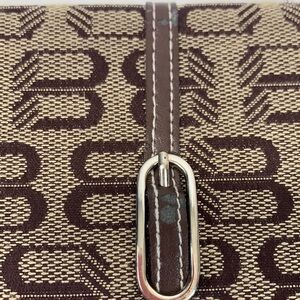 Fabric and faux leather trifold wallet. The external zip pocket has a zippered coin purse, key fob & 4 slip pockets. Flap has a metal snap closure and opens to a check book slot, calculator, ID window, 3 slip pockets, 9 card slots and a pen holder.