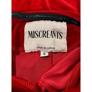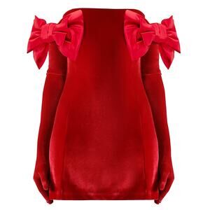 Miscreants Red Velvet Cupid Dress Size 6: strapless neckline, a high slit to the leg, this mini dress is made from a premium stretch velvet for a sophisticated silhouette, with matching long velvet gloves, this chic set is finished with matching red duchess satin bows, measurements: 13 inch bust width x 11 inch waist width x 15 inch hip width x 23 inch length, light discolorations on both bow pieces, dress, bows, and gloves are separate pieces, missing care and fabric content tags, dry cleaning recommended for all pieces.