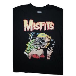 Classic Misfits graphic tee featuring retro horror-inspired artwork of a skeleton hand and woman in a bold comic style. Officially licensed 2014 print under Cinder Block, printed on a BandMerch blank. Black, size XL. A must-have for punk rock fans and collectors of vintage-style Misfits merch.