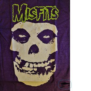 Purple Mineral Wash heavy cotton T-shirt from legendary Misfits with classic Fiend Skull and band Logo design on the front. 100% heavy cotton. Review pictures for intentional cuts on the neck, sleeve, bottom and front marked in blue.