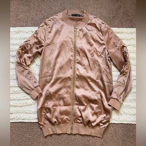 In great condition, worn maybe once. This is a thin silky jacket in a rose gold shimmery color with lace-up ties on the sleeves!