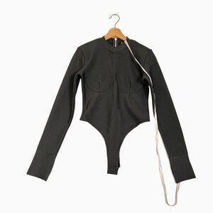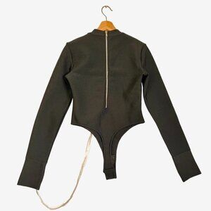 This bodysuit features a high-neck with an underwire bust detail, exposed zipper down the back and thumb holes at the cuffs for a sport lux vibe.
