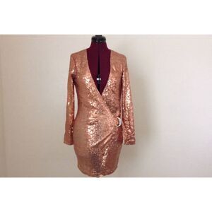 New with Tags from Missguided Premium.Size US 6/UK 10 Sequin Blazer Wrap Dress in Gold. Features all over Shiny Gold sequins. Deep V-front, Wrap style with hidden button closure on one side and belt to loop on left side.