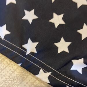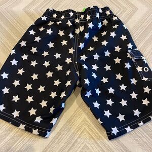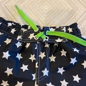 Mish Boys Navy Blue with White Stars Boys Swim Trunks. Lined. Green tie. Pocket. Made of polyester. Size S/5. Gently worn.