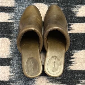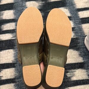 Stylish olive green leather clogs. Comfortable and chic design. Perfect for casual wear.