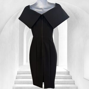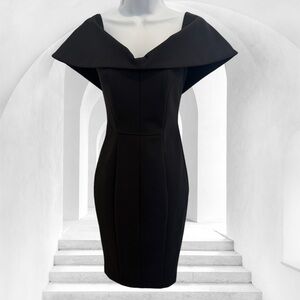 Elevate your cocktail attire with the Misha Collection Black Brooklyn Dress Style RE1641DRBK in size 4. This elegant midi dress features a solid pattern, off the shoulder neckline, and short sleeves.