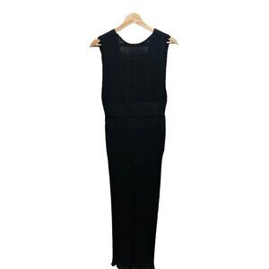 "Misha Collection" presents the Larissa Black Wide Leg Sheer Pleated Jumpsuit Romper. This glamorous piece, made from the finest polyester, boasts a sophisticated design, sleeveless, open back and mostly sheer body, in size M. Excellent condition, gently worn.