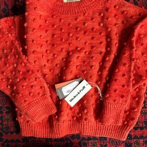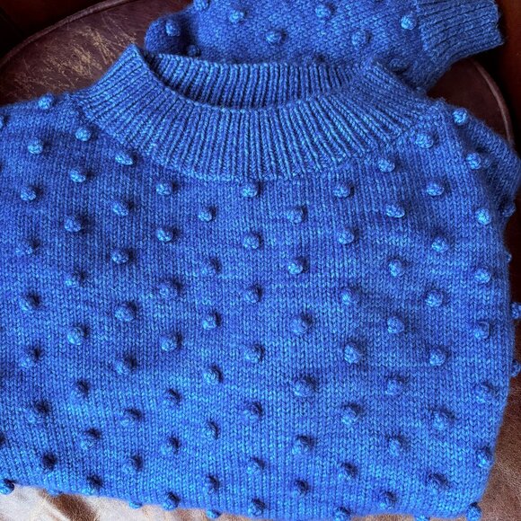 A hand-knit popcorn-stitch pullover sweater in hand-dyed Merino wool, featuring drop shoulders, a boxy silhouette with a slight drawn-in waist, and a subtle mock neck.