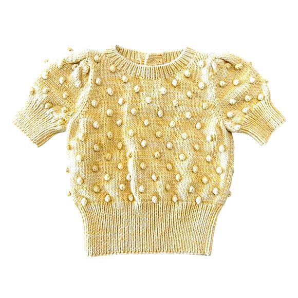 Beautifully hand-knit style Misha & Puff sweater in 100% pima cotton. Features a textured popcorn knit, puff sleeves, and a gathered waist for a timeless, vintage-inspired look. Crafted with care and perfect for layering in any season.