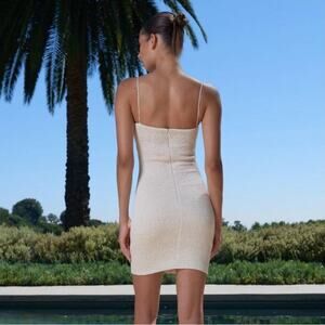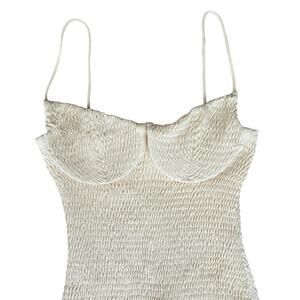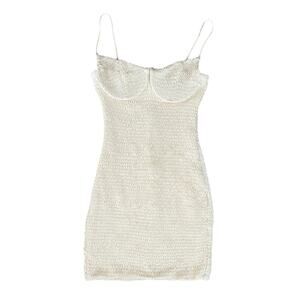 Features- figure hugging mini dress includes a ruched exterior layer, with a defined bust in a “pearl” white fabric