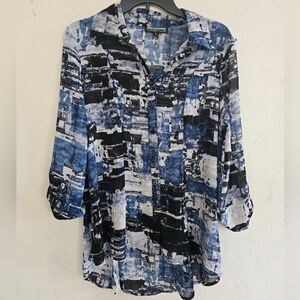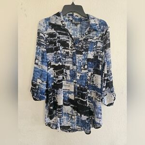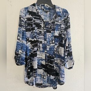 Mishca Blouse Women M Mixed Media Print Roll Tab Sleeve Colorful Button Up