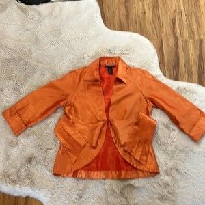 Super fun and cheery bright orange tie front jacket with three quarter length cuff sleeves. 100% Polyester. Women's size small. Good preowned condition, no stains rips or snags