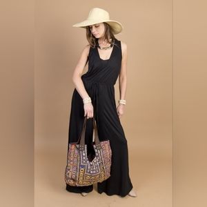 Casual boho chic 70s-style jumpsuit. Stretchy viscose fabric, wide leg cut, with a tie you can cinch at your waist or leave low on your hip. Casual, comfortable look for going out during the day, and dress up for night. Sexy look, but you feel like you're wearing your pajamas!