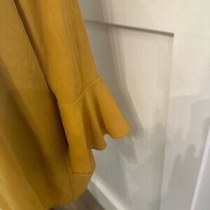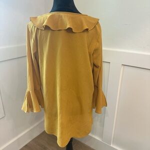 Chic mustard blouse with elegant ruffles. Perfect for versatile styling. 0111