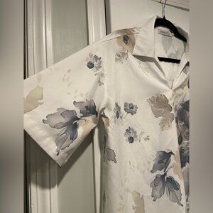 Mislook Size L Blue Cream Floral Collared Short Sleeve V Neck Popover Blouse