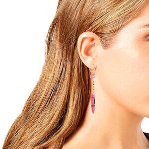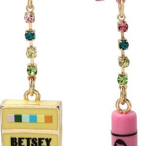 Fun and quirky mismatched drop earrings perfect for adding a playful touch to any outfit! Featuring a charming pink metal bow, colorful stone cup chain detail, and mismatched drops including a cute "Betsey Crayons" box and pink crayon. Set in gold-tone metal with a comfortable lever back closure, these earrings are lightweight and eye-catching.