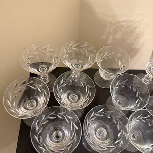 Mismatched set of leaf etched crystal wine glasses, different styles