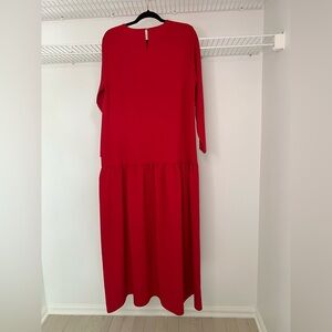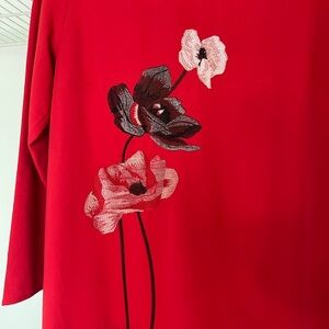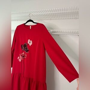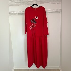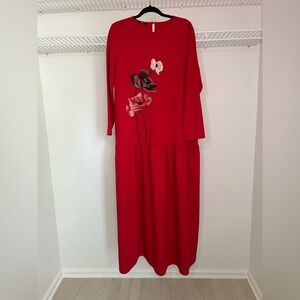 Beautiful bright red with drop waist. Embroidered poppies on the front in red and black. Keyhole at back of neck. Material is thick and substantial. Flaws include: ink vs marker at the back of the dress by the keyhole and the back of the left sleeve. I have not attempted to launder this dress to remove them. Size medium.
