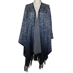 Misook Open Front Blue and Black Fringe Poncho Wrap Shawl Cardigan One Size