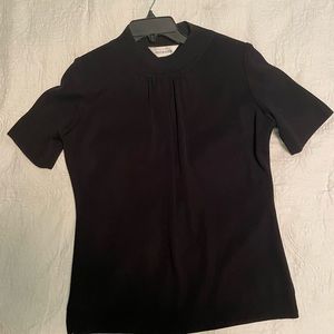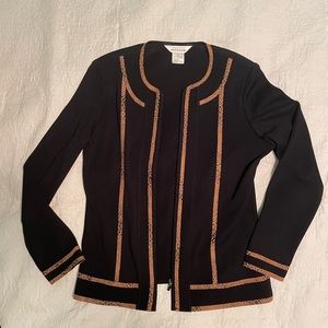 In great condition, no signs of wear! Black Misook sweater with cheetah print trim/decoration. Zipper closure down the front. High neck short sleeve black undershirt with decorative stitching at the neckline. Size: XS (both the sweater and shirt). Color: Black with cheetah print detailing.