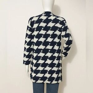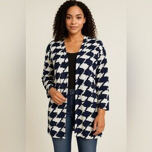 This cardigan from the brand Misook features a bold, oversized houndstooth pattern in navy blue and white. The design is classic yet modern, with an open-front style and a relaxed, longline fit. The lightweight knit fabric provides comfort and versatility, making it a perfect layering piece for both casual and business-casual looks. The clean, collarless neckline adds to its polished aesthetic. One hook