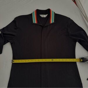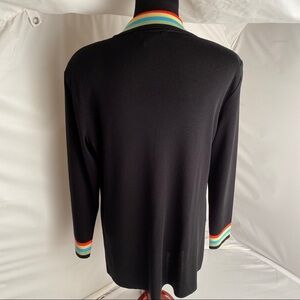 Misook black knit open cardigan with striped collar and cuffs. Stripes are red, yellow, blue, green. Has shoulder pads. Like new - no flaws. Smoke free home.
