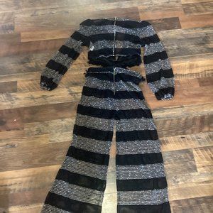 Adorable boutique jumpsuits by M1558 Los Angeles. Connects at the naval region. Measurements are showing, I would say about 28-29” waist so I this is a size small. Showstopper!!! The pictures do not do this jumpsuit justice! Absolutely gorgeous!