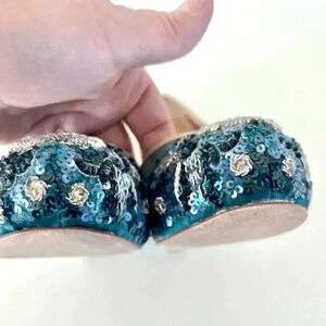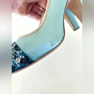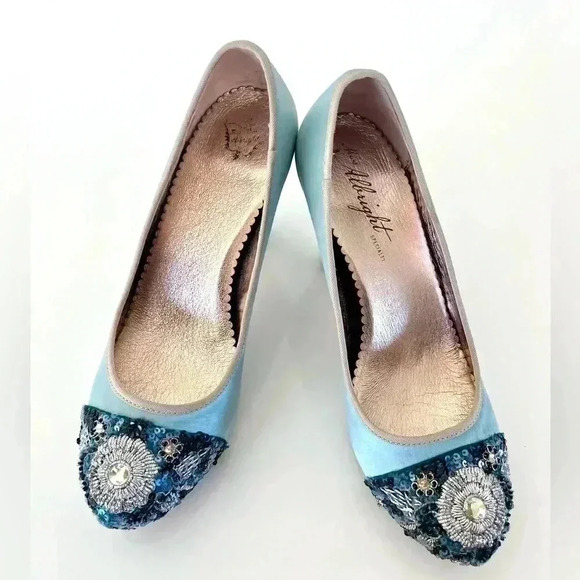 Anthropologie Miss Albright Bijou Teal Blue Satin & Beaded Sequin Rhinestone Cap Toe Heels